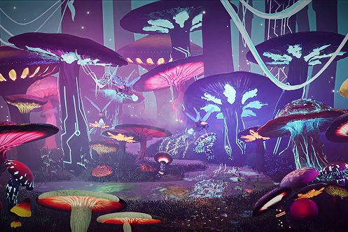 A fully 3D cyber-aesthetic scene with detailed environmental elements was created. The video was produced in Unreal Engine and adapted for display within the complex space.
