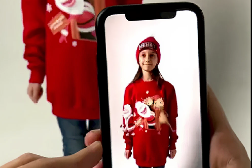 Based on the client’s sketches, 3D models of Santa and a reindeer were created. The characters are animated and activated in augmented reality, dancing and interacting directly on the clothing print.