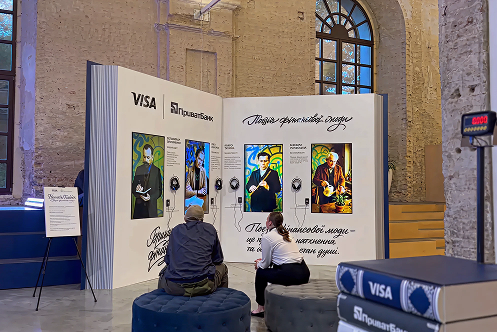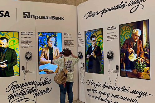 Разработана инсталляция «Книга поэзии финансовой моды» с AI-синтезом голосов классиков литературы. NFC-технология позволяла активировать аудиоконтент прикосновением карты Visa от ПриватБанка. Для каждого автора создан персональный сценарий с уникальными текстами и голосовой подачей.